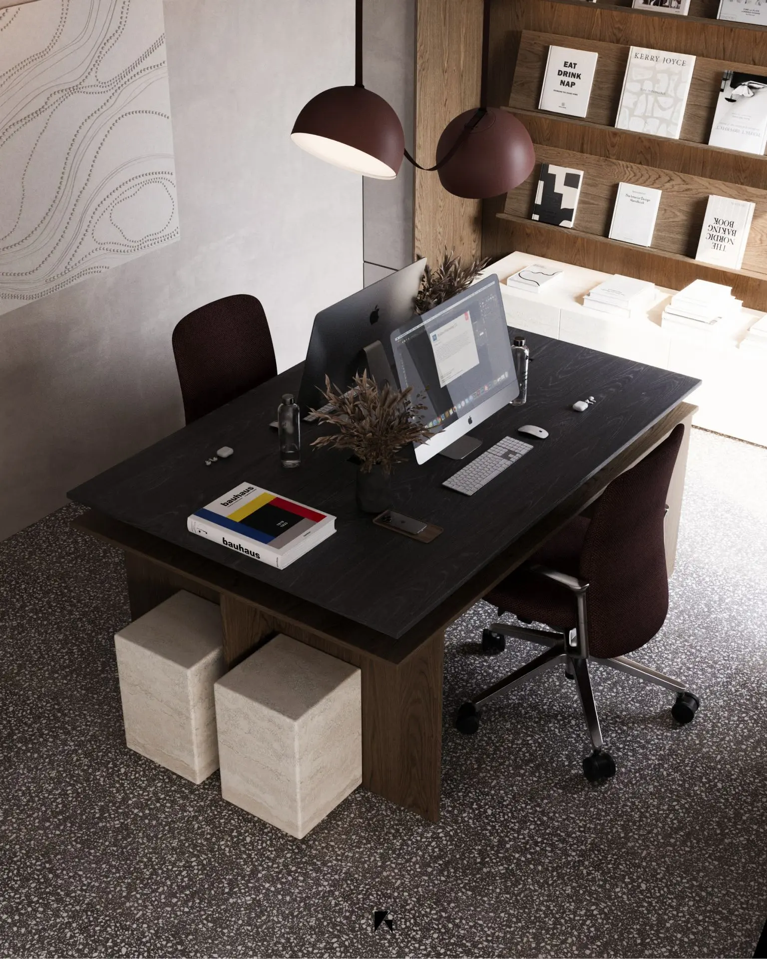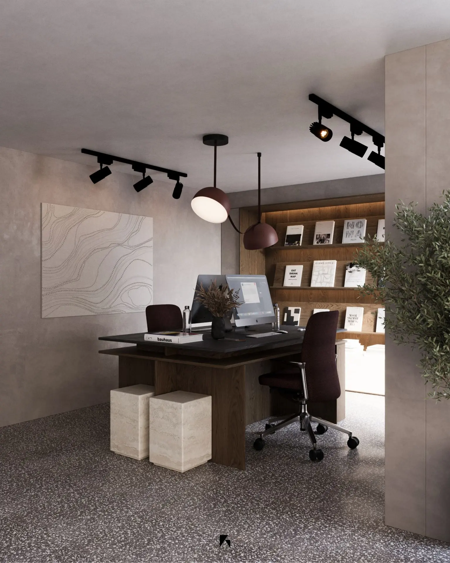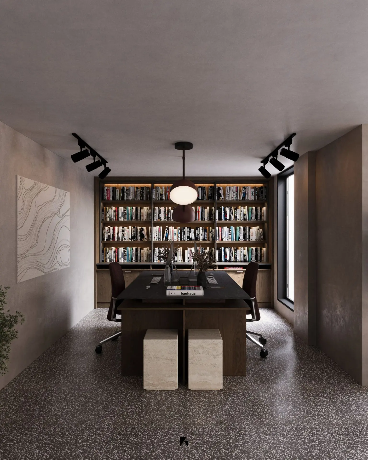 This interior design blends warmth and functionality in a refined minimalist setting. The space features a dark wooden desk framed by sleek travertine stools, complemented by deep-toned chairs and ambient pendant lighting. A custom-built bookshelf serves as both a design statement and practical storage, illuminated to highlight curated books and objects. Textured walls, terrazzo flooring, and natural light from the side window create a calm, sophisticated atmosphere—ideal for focused work or creative collaboration. The composition embodies timeless modern aesthetics with a subtle touch of material richness and balance.