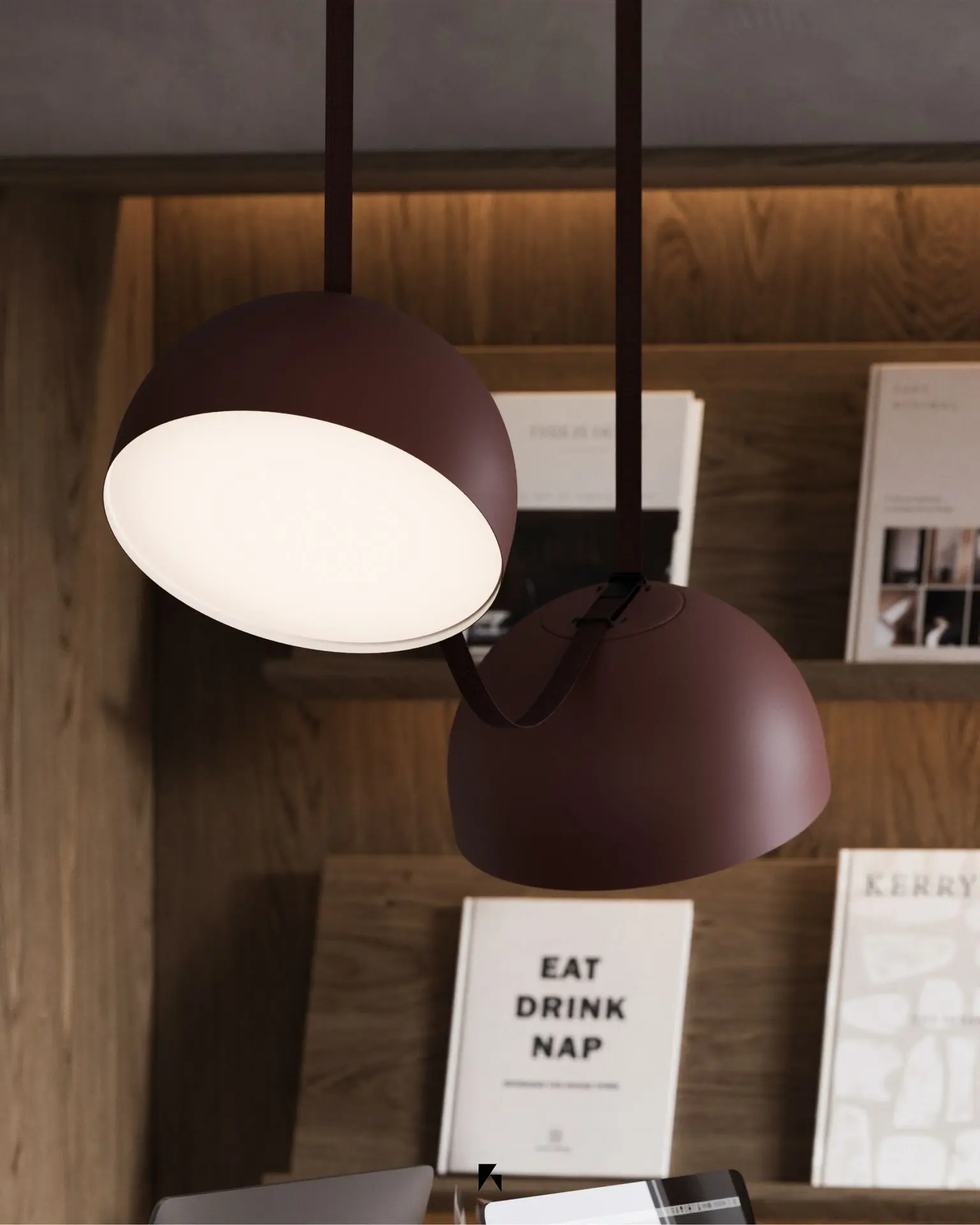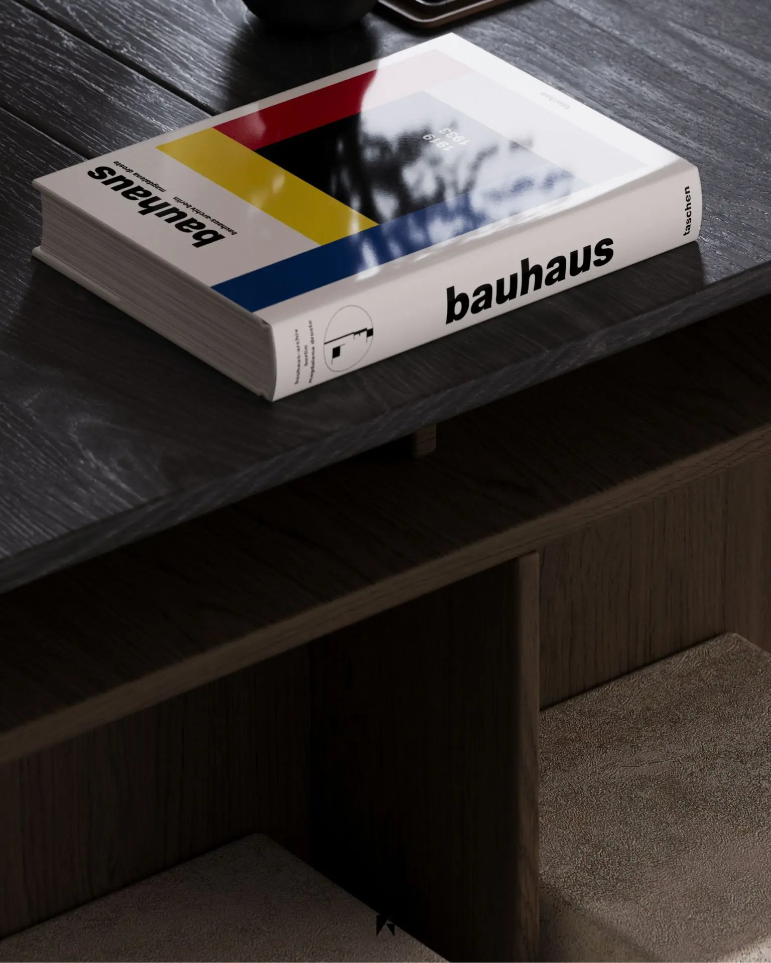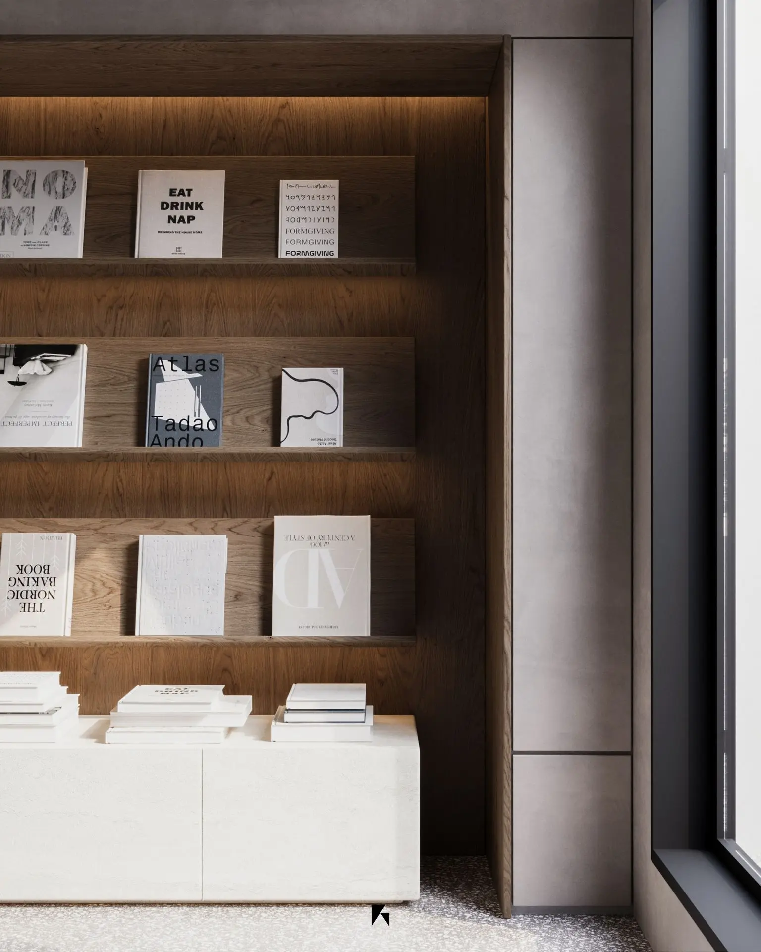 This interior design blends warmth and functionality in a refined minimalist setting. The space features a dark wooden desk framed by sleek travertine stools, complemented by deep-toned chairs and ambient pendant lighting. A custom-built bookshelf serves as both a design statement and practical storage, illuminated to highlight curated books and objects. Textured walls, terrazzo flooring, and natural light from the side window create a calm, sophisticated atmosphere—ideal for focused work or creative collaboration. The composition embodies timeless modern aesthetics with a subtle touch of material richness and balance.